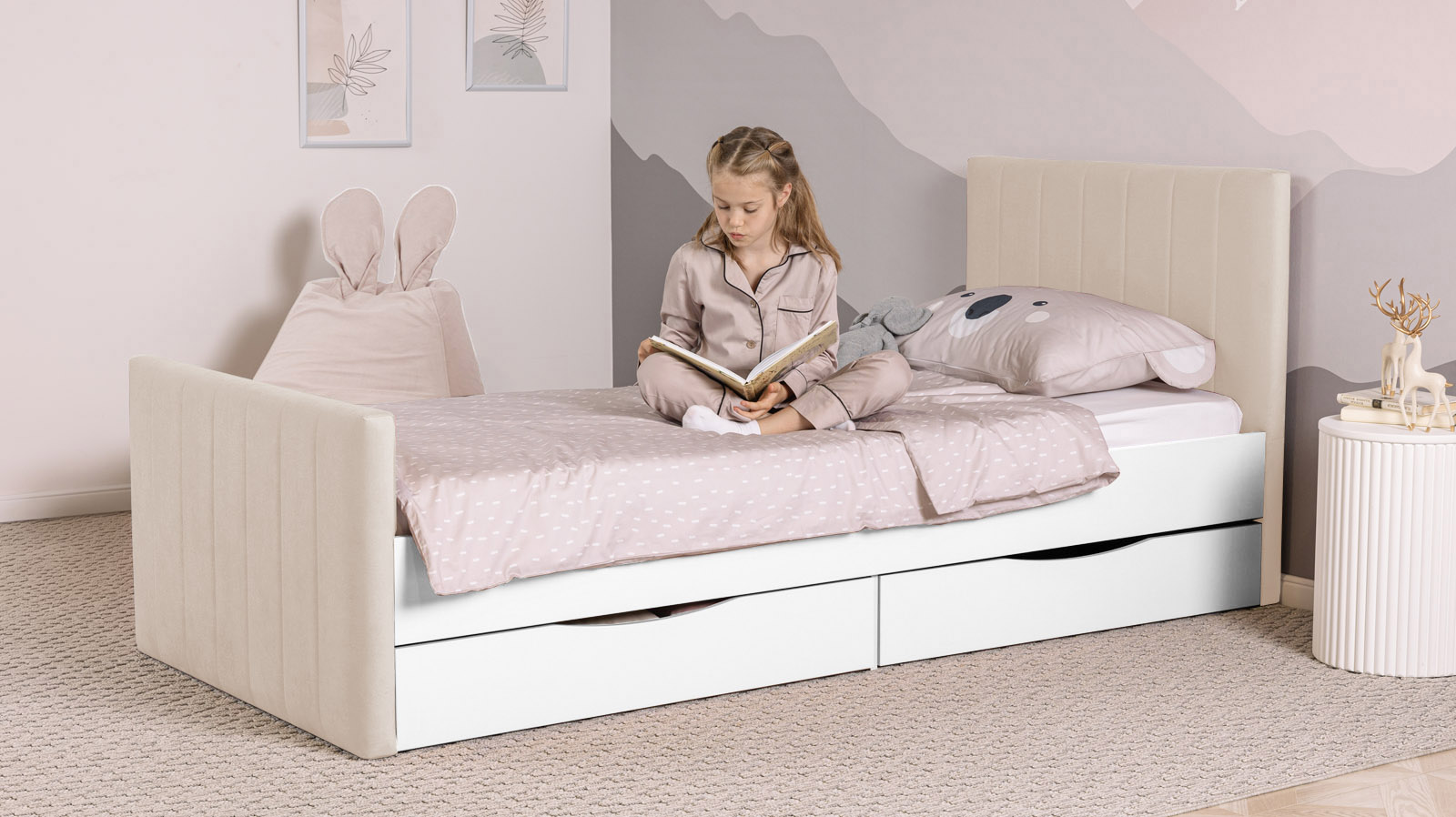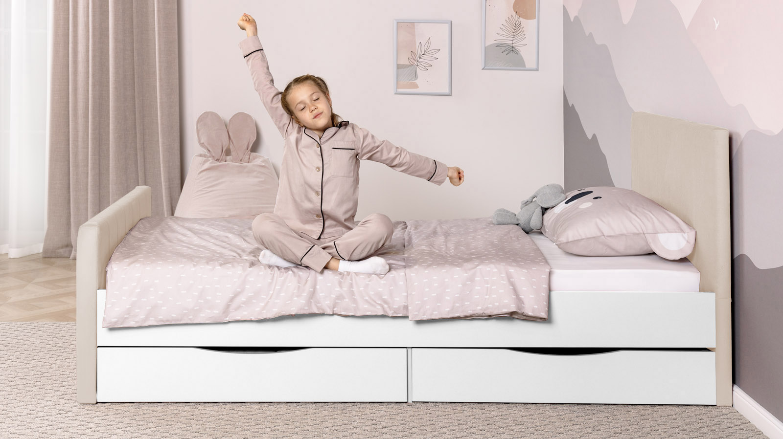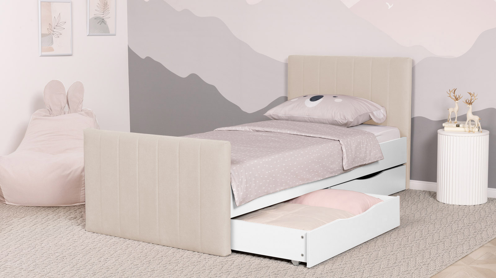 Дополнительным бонусом являются два выкатных ящика, которые обеспечивают полезное пространство для хранения игрушек, одежды и постельных принадлежностей. Это особенно актуально для детских комнат, где порядок имеет решающее значение.