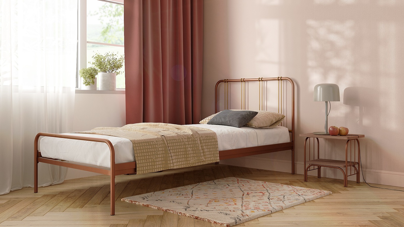 - экологичность - металл не впитывает в себя и не выделяет вредные вещества, поэтому он идеально подходит для спальни;