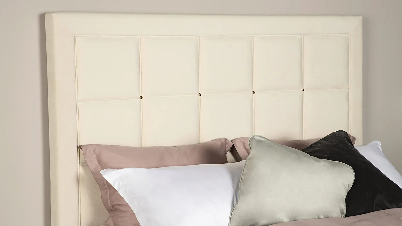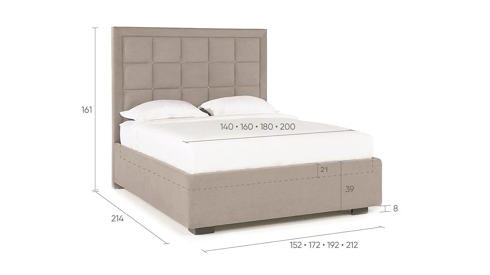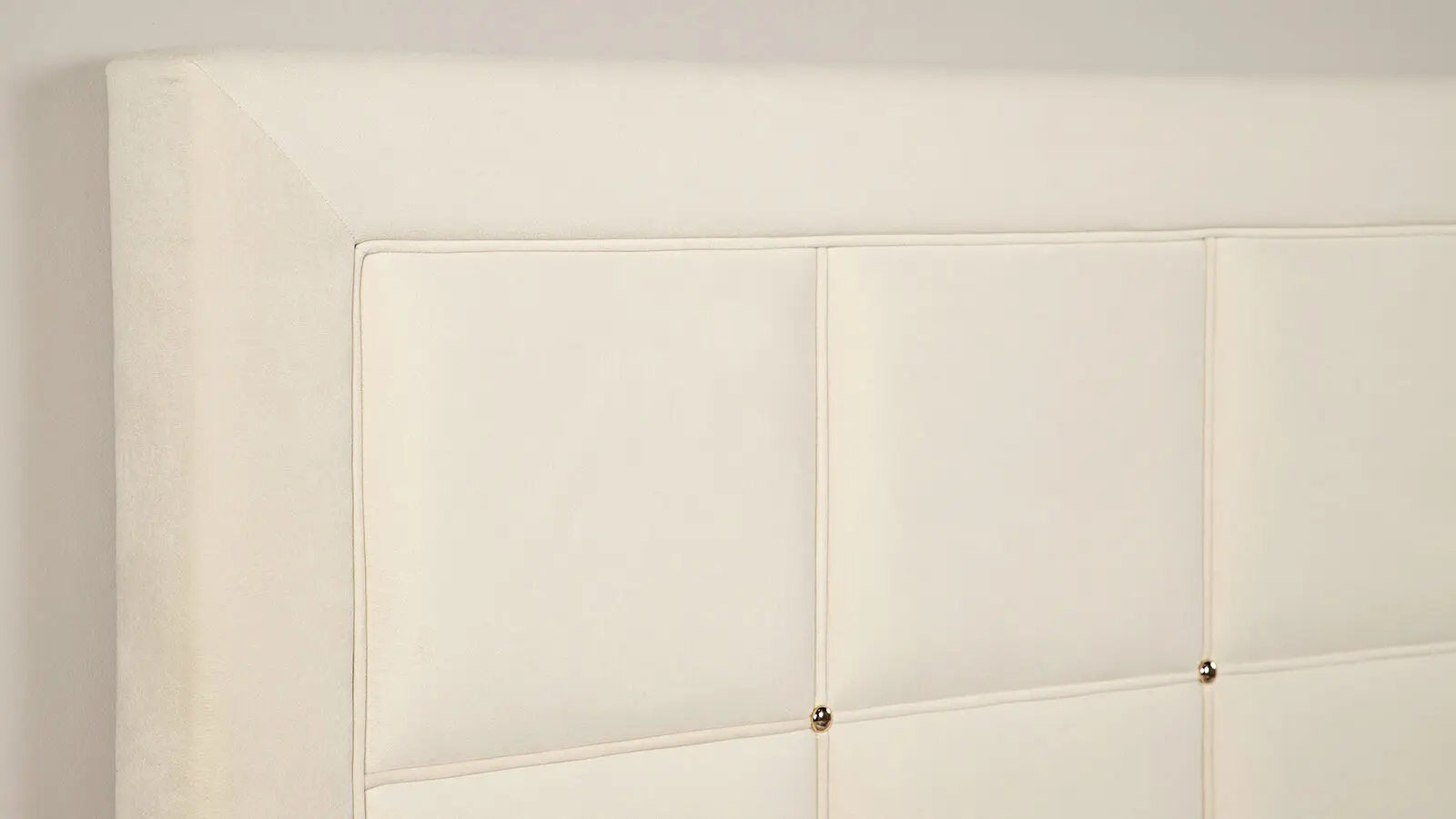 Высокое рельефное изголовье с мягкими квадратами декорировано кантом, который образует рисунок спинки. Цвет канта Вы можете подобрать как в тон с обивкой, так и сделать изголовье контрастным. Спинка кровати украшена пуговицами цвета «золото» или «хром».
