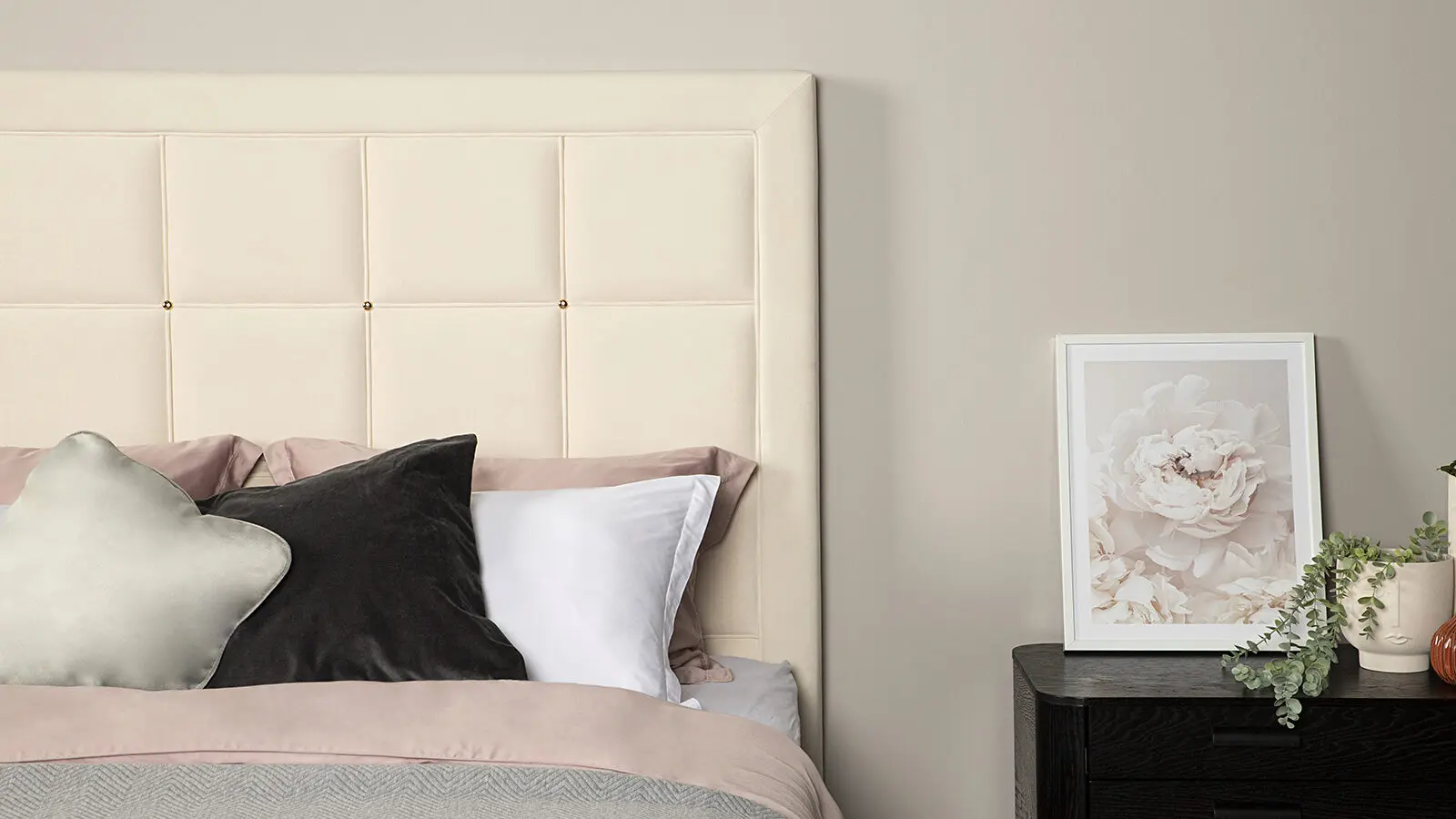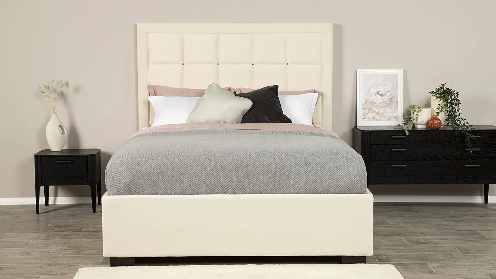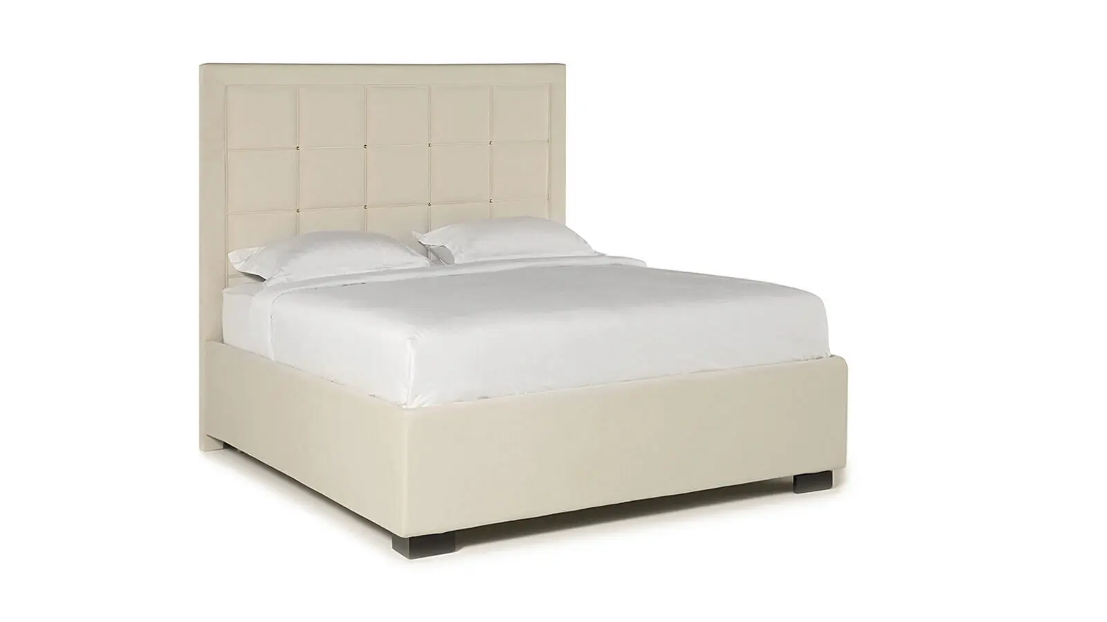 Высокое рельефное изголовье с мягкими квадратами декорировано кантом, который образует рисунок спинки. Цвет канта Вы можете подобрать как в тон с обивкой, так и сделать изголовье контрастным. Спинка кровати украшена пуговицами цвета «золото» или «хром».