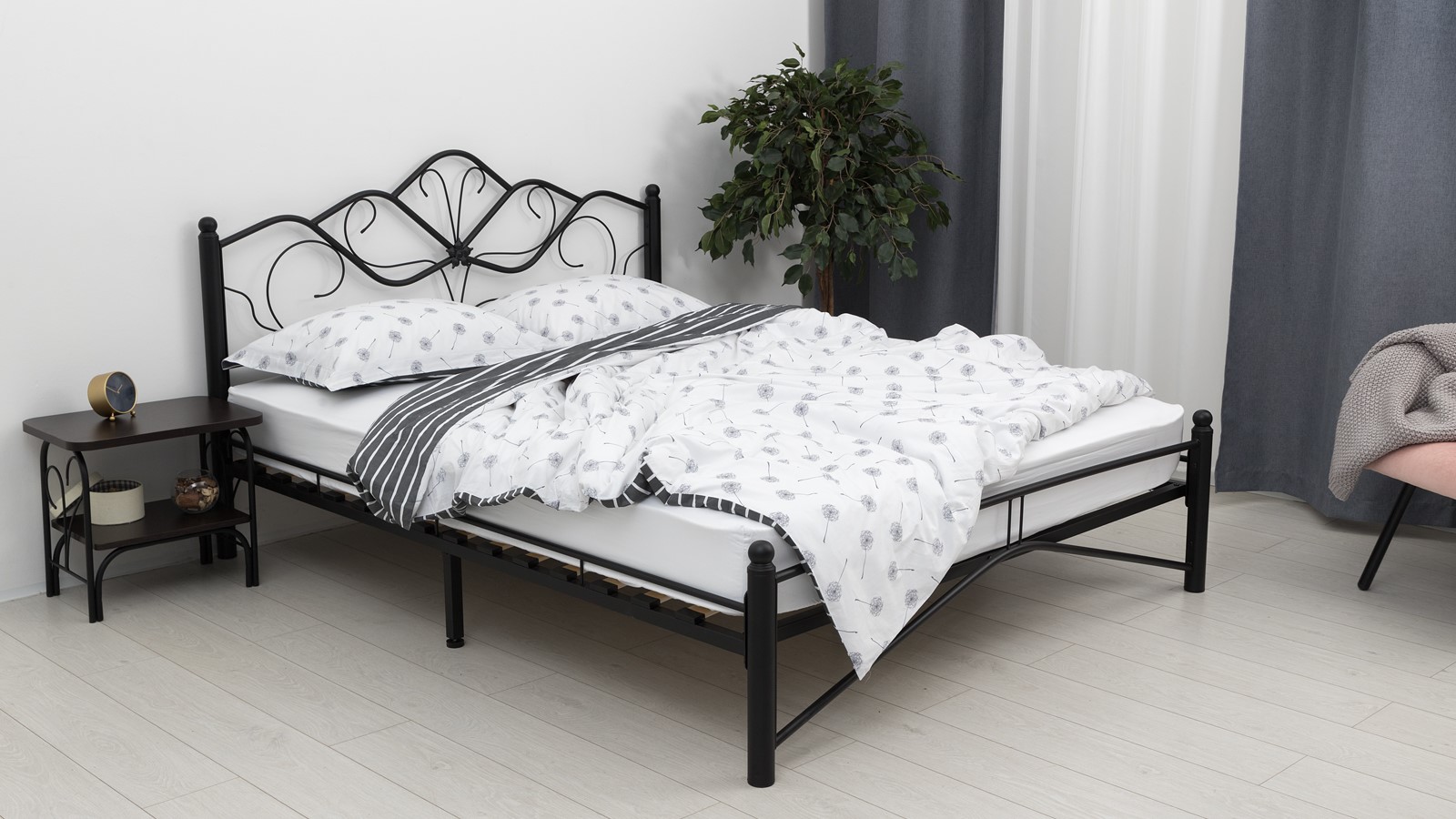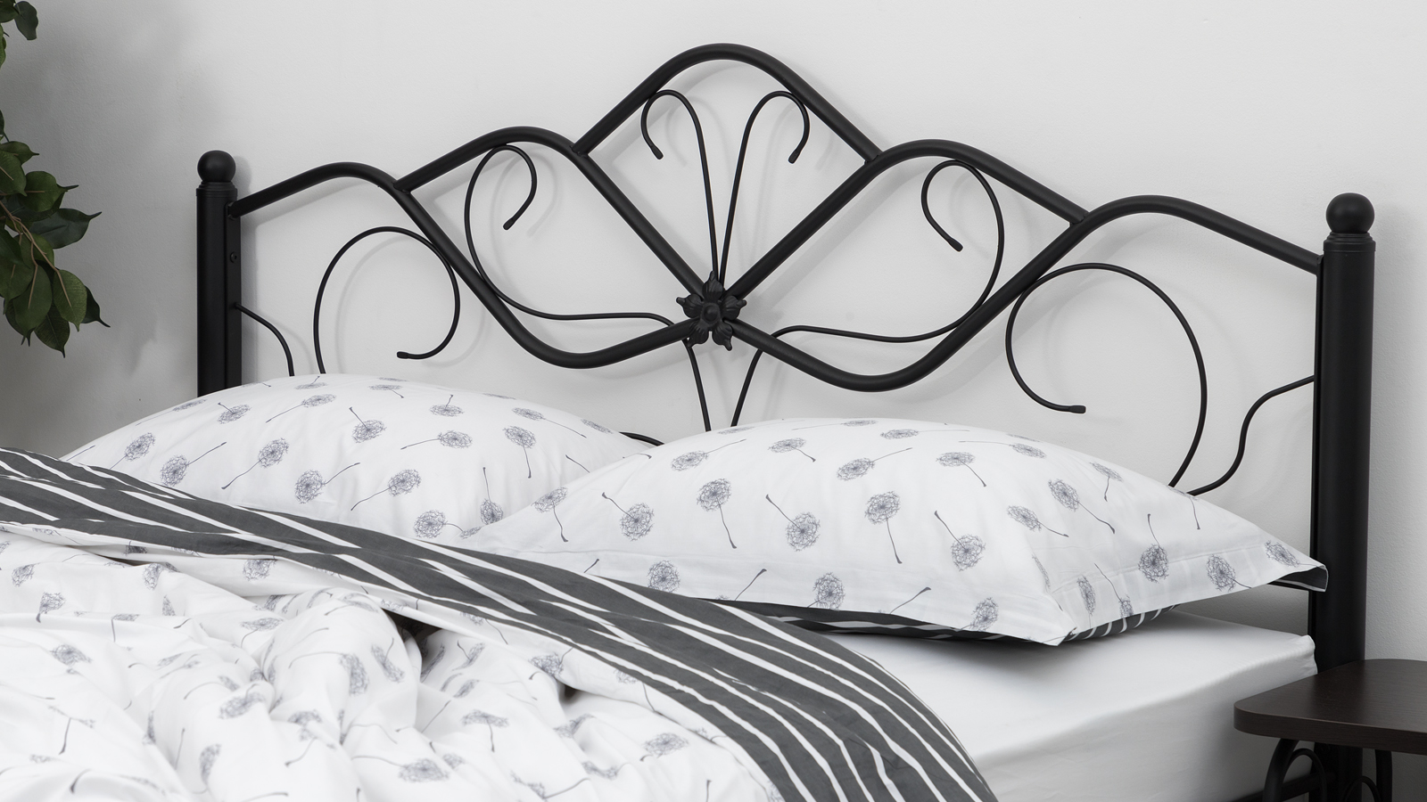 Изящный кованый орнамент изголовья – с растительными мотивами: напоминает лепестки цветка и передает нежность и красоту природных линий, наполняет интерьер атмосферой романтики.