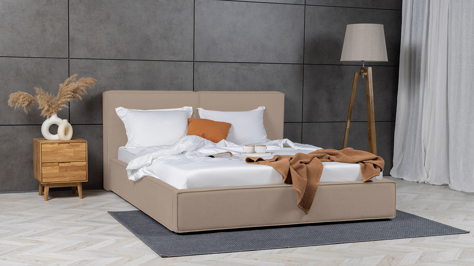 Кровать Murrey Nova отражает лучшие современные тренды дизайна. Мягкое объемное изголовье в виде подушек, стильные декоративные защипы и правильная геометрия.