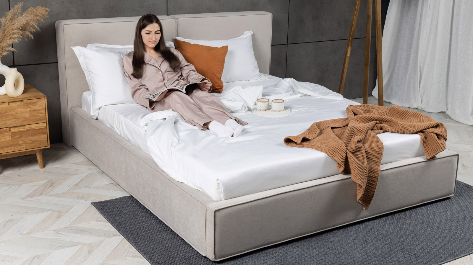 Кровать очень красивая и удобная. Изголовье мягкое, можно читать, сидя в кровати. Цвет подошёл идеально под интерьер.