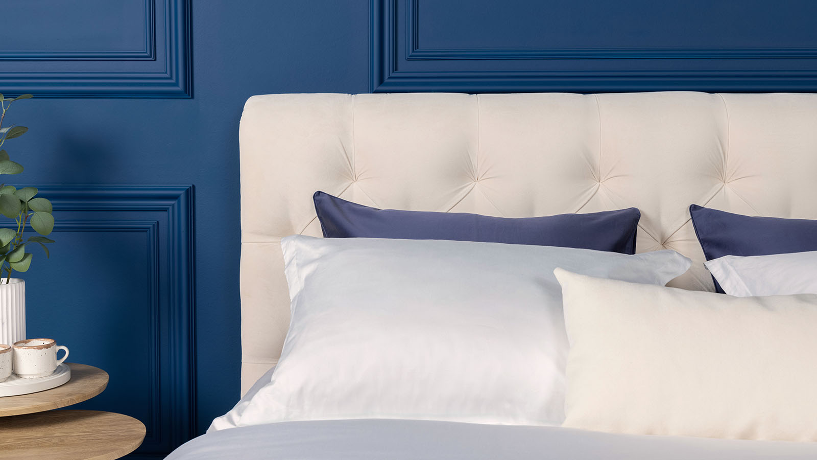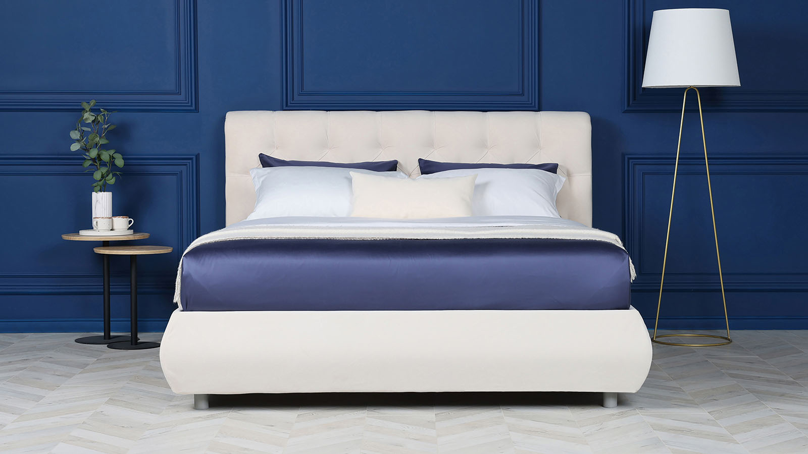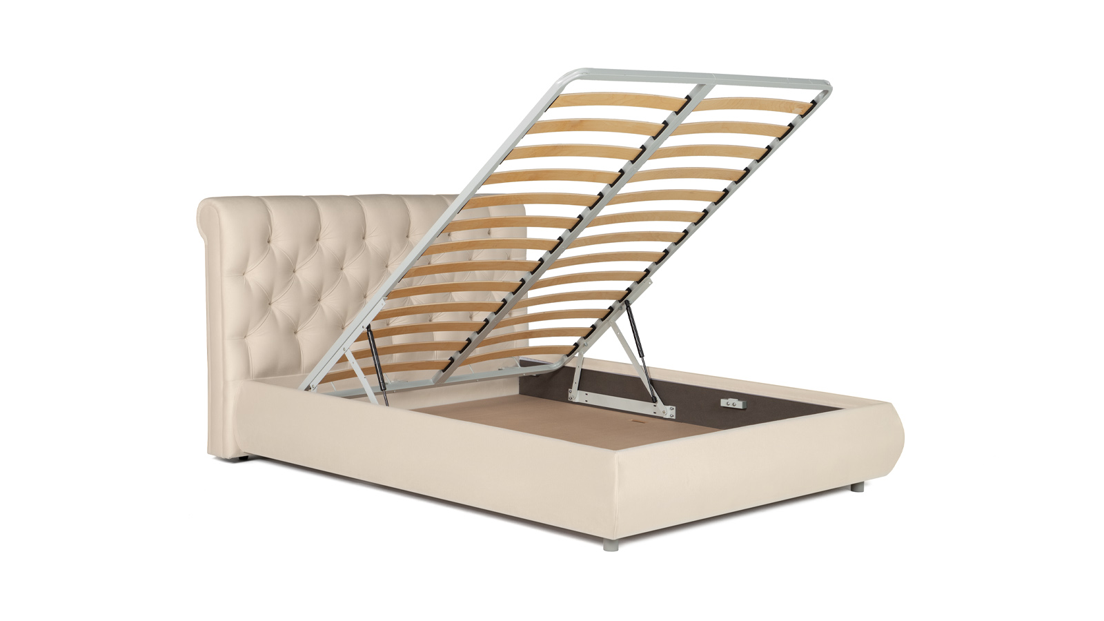 Закругленное изголовье с каретной стяжкой – в стиле европейской классики 18 века, традиционно символизирует роскошь и достаток. Ромбовидная утяжка и складки материала выглядят изысканно.