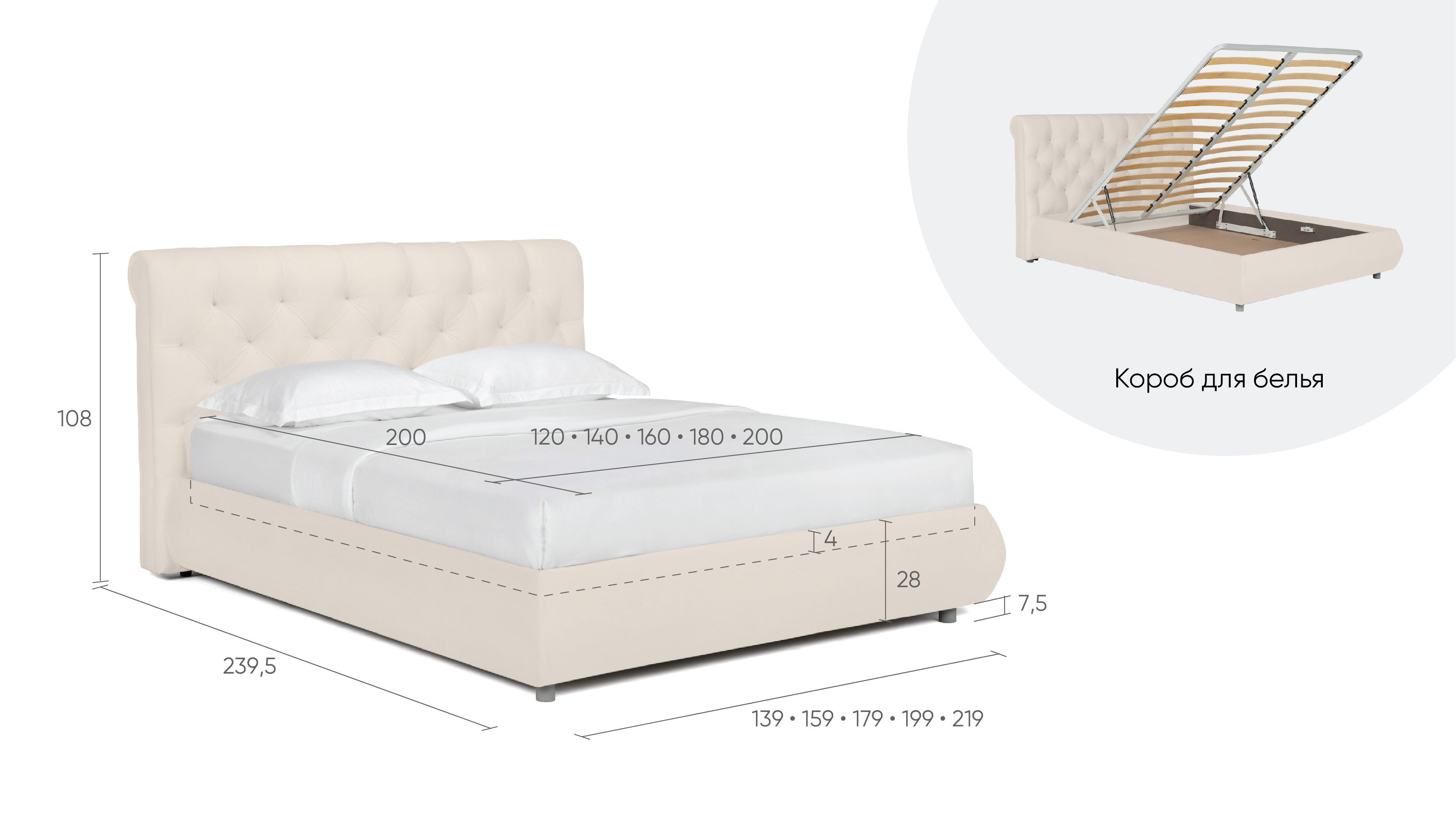 При комплектации кровати трансформируемым основанием Ergomotion надо заказывать увеличенную длину спального места – 203 см (бесплатно).