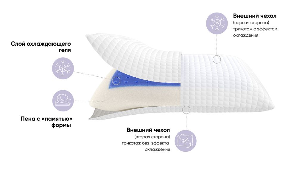 - Основа подушки: пена с памятью формы (100% пенополиуретан) + слой охлаждающего геля;